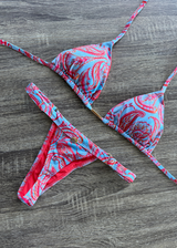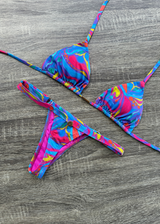 Sliding triangle top, halter neck, tie back, and removable pads.