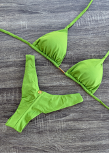 Sliding triangle top, halter neck, tie back, and removable pads.