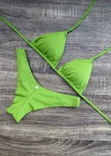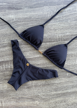 Sliding triangle top, halter neck, tie back, and removable pads.